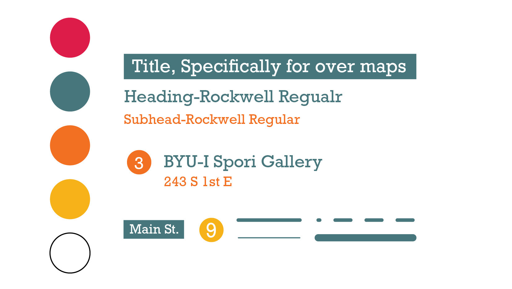 Legibility was key in creating a typography guide. Symbols were inspired by maps, both physical and digital. The numbers in circles are purposely off-center to point back to transportation guides.