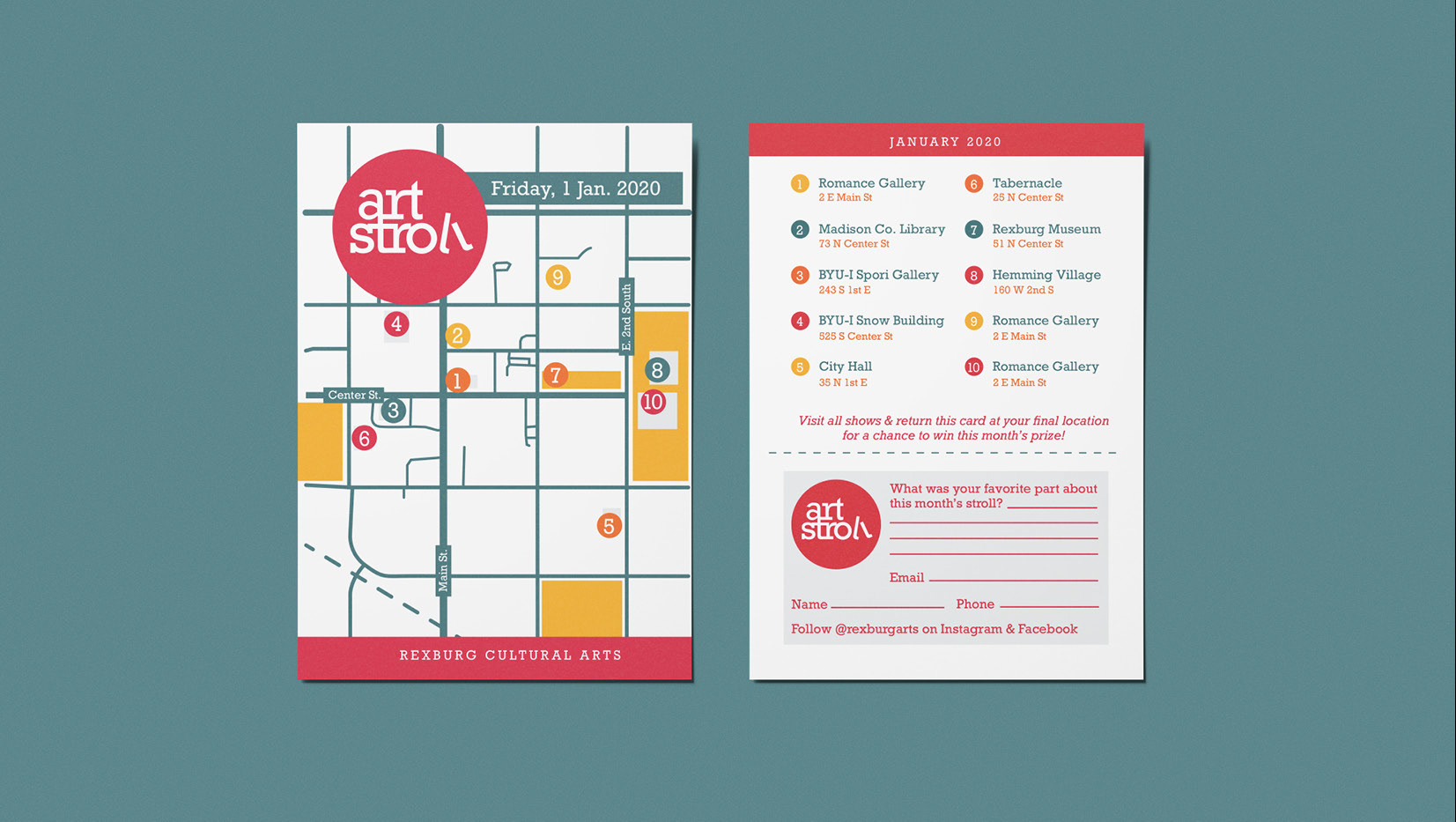 Featuring an actual "stroll" as well as maps of the town, the inspiration behind the visuals was meant to reflect maps, transportation and walks. This project was worked on jointly with the director of arts for the city of Rexburg.