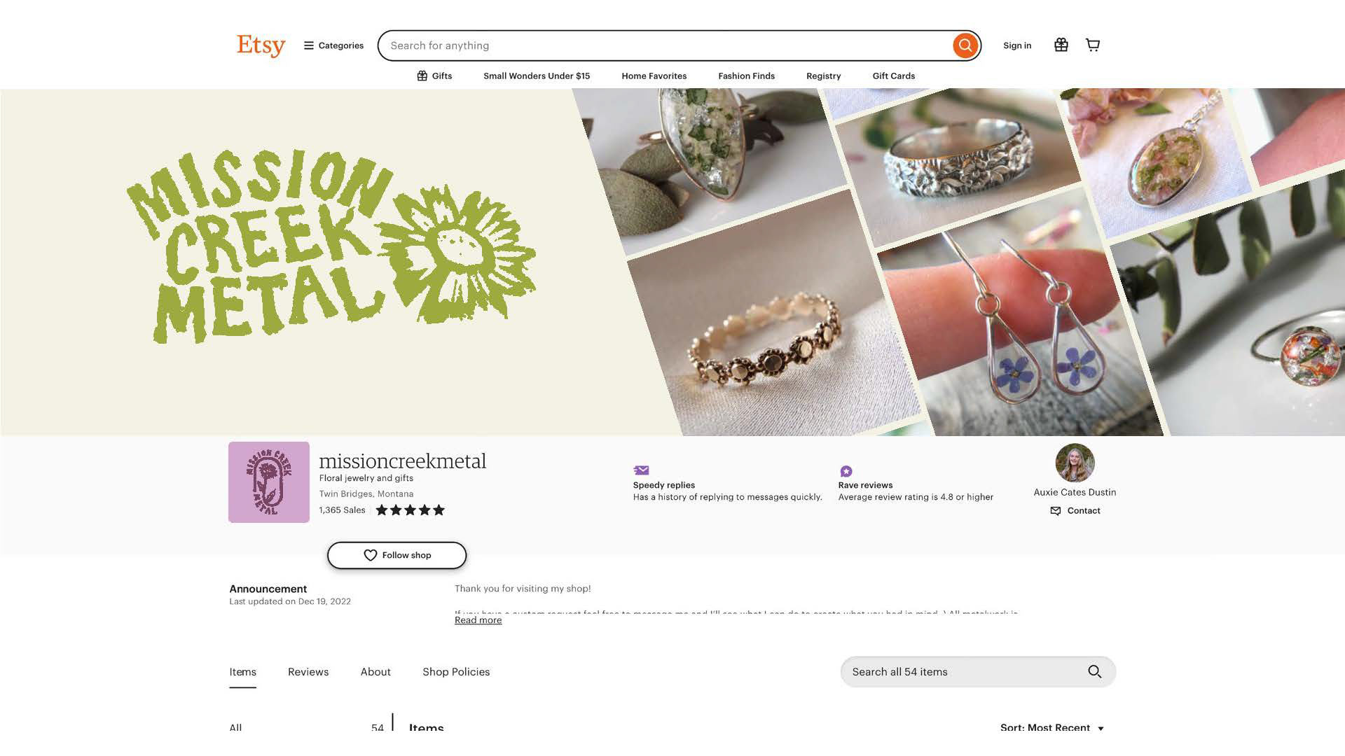 Mission Creek Metal is a small jewelry brand that crafts unique handmade metal jewelry. They specialize in custom designs and using flower petals to create personal pieces to commemorate meaningful events or people. This brand is based in Montana and the metalsmith owner has a special love for all things Montana and wildflowers.